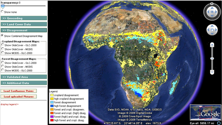Agriculture: Supporting sustainable agriculture and combating desertificationGeo-wiki.org - Crowdsourcing to improve Landcover ValidationImproving the quality of spatial information: With an ever increasing dependence on spatial information, and an increasing importance placed on results derived from that information, it becomes crucial to better harmonize and understand the quality of this expanding volume of data. New opportunities exist to collect additional spatial information via the Internet that were non-existent until just a few years ago. Additionally, many international, intergovernmental protocols and conventions rely on this information (e.g. the Kyoto Protocol, the Convention on Biological Diversity, the Convention to Combat Desertification; and others). However, much of the spatial data used to support these important initiatives is conflicting or contains limited validation. New efforts are thus required to improve the quality of spatial information. What we do: Currently in geo-wiki.org, volunteers have the ability to view both cropland and forest Disagreement Maps that were derived from three recent global land cover datasets: GLC-2000, MODIS and GlobCover. Disagreement Maps guide the volunteers to areas of the globe with the highest levels of disagreement – prioritizing the disagreement hotspots in a global cropland/forest Disagreement Map (Fig. 1). With the help of Google Earth, the next step is to select and visualize available high resolution images as well as to upload or view geo-tagged field pictures (e.g., from Panoramio.com, Confluence.org, or from research projects such as the Global Monitoring for Food security Project (GMFS)), and determine which land cover type is found on the ground (Fig. 2). Volunteers are then asked to decide if the land cover products correctly capture what they see or know to exist on the ground. In addition, it is possible to recommend a new land cover class (i.e. select from a list of possible land cover types, and upload available photos to support the decision). All information entered by volunteers is recorded in a publically available spatial database. This validation database contains a record of the agreement among the datasets, and can be used in the future to create an improved hybrid dataset. Who we are: