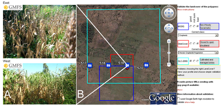 Figure 2. Geo-tagged photos uploaded in geo-wiki.org (A) confirming the actual land cover seen in Google Earth high resolution images (B). Using the high resolution images available in Google Earth, in combination with available photos, a volunteer can correct existing land cover products. |