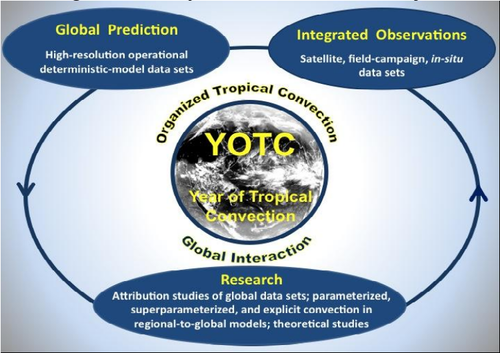 Climate: Understanding, assessing, predicting, mitigating, and adapting to climate variability and changeYear of Tropical Convection (YOTC): A Virtual Global Field CampaignThe ChallengeCoordinated jointly by the WCRP and WWRP/THORPEX, the Year of Tropical Convection (YOTC) project recognizes that within the 10-year implementation of GEOSS, a paradigm change is needed in how the tropics are represented in climate models. As a fundamental element of Earth-system science of societal relevance, tropical convection is organized into complex multi-scale precipitation systems that are building blocks of high-impact meteorological events. Directly or indirectly, these events affect a huge percentage of the world’s population. The motivation, science, and implementation are available at www.ucar.edu/yotc. Much of the uncertainty associated with weather and climate derives from our incomplete understanding of how the meteorological scales at the intersection of weather and climate – the mesoscale (10-100 km), synoptic (1000 km), and planetary – interact with each other. This complicates our attempts to predict high-impact phenomena associated with the tropical atmosphere, such as the monsoons and tropical cyclones. These and other phenomena influence the weather and climate of the mid- and high-latitudes through the migration of weather systems out of the tropics or through the effects of tropical convection on the atmospheric circulation that extend to, or strongly influence, the extra-tropics by planetary-wave telecommunication. It will be impossible to predict climate on regional scales or to comprehend the variability of the global water cycle in a warmer world without comprehensively addressing tropical convection and its interactions across time and space scales. A creative application of the global integrated Earth observation, numerical computation and theory, the YOTC project addresses most of the objectives in the GEOSS paper. That includes international integration, cross-cutting, and inter-agency collaboration and involves in-situ, airborne, and space-based observations; data integration and information fusion; the effective use of global and regional products; and fundamental research. The YOTC project addresses the Climate, Weather, and Water Societal Benefit Areas (SBAs) of GEOSS, and has relevance to its Agriculture and Disasters SBAs. YOTC is a key element of the seamless prediction of weather and climate (a GEO priority) and is aligned with WCRP's GEWEX and CLIVAR programs. As task CL-09-01a of the GEO Work Plan, it is fully integrated with GEO's objectives and societal benefit areas. The YOTC project utilizes resources in an entirely new integrative way in the form of a virtual global field campaign. "Virtual" means that the atmosphere and its variability are not sampled through a new, specialized and costly field campaign, but instead are represented by a variety of available, yet relatively new, state-of-the-art resources. Advantages of the virtual approach include cost effectiveness and flexibility. It is cost effective because the data already exist in operational weather centers and via satellite data centers. It is flexible because the virtual database can progressively be improved as new data-assimilation methods become on-stream, new data sources are incorporated in the data-assimilation methods, satellite retrieval algorithms are improved, models attain higher resolution, and physical parameterizations improve. The YOTC research component is focused on complex meteorological phenomena that are long-standing challenges for weather and climate models, e.g., the monsoons, tropical intraseasonal variability, easterly waves and tropical cyclones, and tropical-extratropical interaction. The above three-pronged approach is illustrated in the figure below. The European Centre for Medium-Range Weather Forecasts (ECMWF) in Reading, UK, already has provided a virtual database (25-km mesh) for the "Year," namely May 2008 - April 2010. The US National Centers for Environmental Prediction (NCEP) and the NASA Global Modeling and Assimilation Office (GMAO) also are engaged, and other prediction centers are expected to join. A satellite data dissemination system, based on the Giovanni methodology initially developed at NASA Goddard has been adapted for multi-platform usage. These data are freely available to the community. |