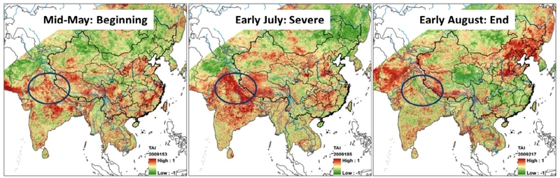 Figure 3: Drought event monitored during the summer 2009 using the Temperature Anomaly Index (Jia et al. 2011), with particular focus on the northern India drought.