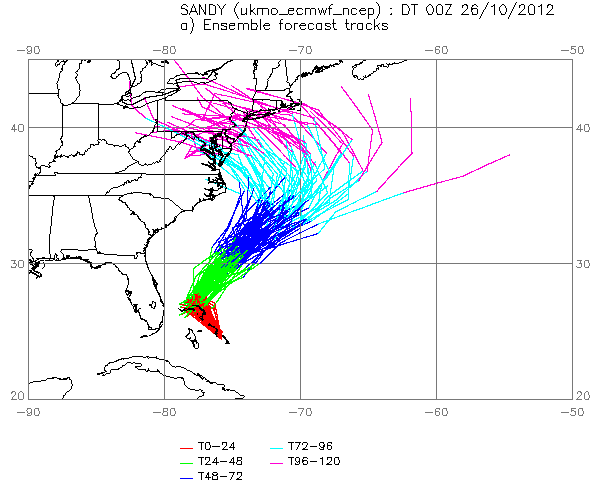 Figure 1: Example of multi-centre ensemble track predictions for hurricane Sandy.