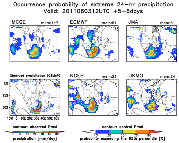 The next step is the generation of products based on gridded forecast fields, with a particular focus on heavy rainfall and strong winds. Using TIGGE data, scientists at the Meteorological Research Institute of the Japan Meteorological Agency (JMA) have developed a set of products that highlight the likelihood of severe weather. Figure 2 shows an example of a plot highlighting the risk of heavy rain from four of the TIGGE ensembles (JMA, ECMWF, Met Office, NCEP), and also a Multi-centre Grand Ensemble (MCGE) combining the four single ensembles. For comparison, the observed rainfall (based on the GSMaP satellite rainfall data set) is also shown. These products are currently only available after a 2-3 day delay, since they are produced from the TIGGE archive data. As part of GEOWOW, it is planned to produce a version of the products in near real-time and to deliver them to forecasters participating in the SWFDP for their guidance.