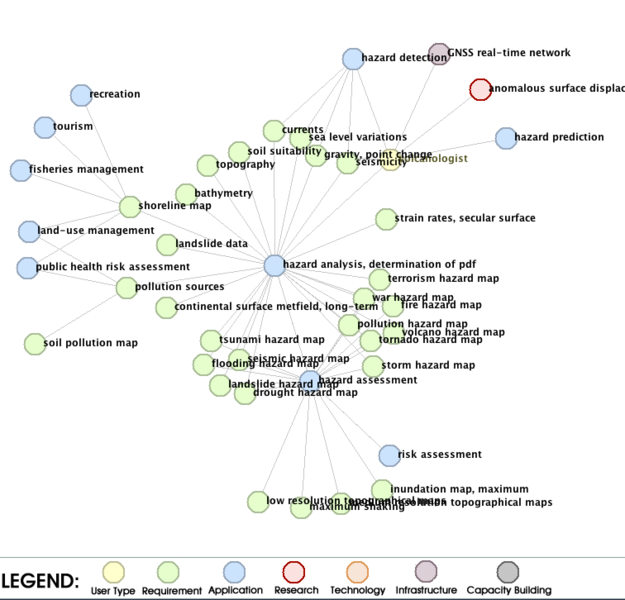 Analysis example: Risk Management - How are seismic observations linked to other URR entries? Here we provide two examples of analyses that are possible with the current version of the URR. In the first example, we want to find how a requirement for seismic observations is connected to other entries. The entry for this requirement is shown on the left. At the bottom, we see a link to relationships. After a click on the 'Relationship' button, a graphical interface opens that displays all current linkages of the Seismicity requirement up to a link level of two (see the Glossary for an explanation of the term "link level"). At the bottom of the diagram, the meaning of the symbol colors is explained. Currently, the seismicity requirement is linked to two applications, i.e., 'hazard analysis, determination of pdf' and 'hazard detection', which in turn are linked to many other requirements, applications, etc. We now want to explore in more detail the application 'hazard analysis, determination of pdf' and move the cursor over the respective symbol until the hyperlink symbol appears. We see that this applications depends on many requirements and feeds into the application 'hazard assessment'. Note that currently the directionality of the links is not displayed. Now we move to 'hazard assessment'. |