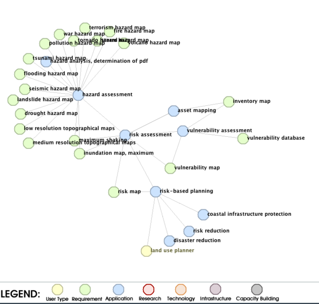 Analysis example: Risk Management - How are seismic observations linked to other URR entries? Here we provide two examples of analyses that are possible with the current version of the URR. In the first example, we want to find how a requirement for seismic observations is connected to other entries. The entry for this requirement is shown on the left. At the bottom, we see a link to relationships. After a click on the 'Relationship' button, a graphical interface opens that displays all current linkages of the Seismicity requirement up to a link level of two (see the Glossary for an explanation of the term "link level"). At the bottom of the diagram, the meaning of the symbol colors is explained. Currently, the seismicity requirement is linked to two applications, i.e., 'hazard analysis, determination of pdf' and 'hazard detection', which in turn are linked to many other requirements, applications, etc. We now want to explore in more detail the application 'hazard analysis, determination of pdf' and move the cursor over the respective symbol until the hyperlink symbol appears. We see that this applications depends on many requirements and feeds into the application 'hazard assessment'. Note that currently the directionality of the links is not displayed. Now we move to 'hazard assessment'. The application 'hazard assessment' is linked to 'risk assessment'. We want to further explore this value chain from the observational requirement for seismicity down to the ultimate end application. The application 'risk assessment' depends also on 'asset mapping' and 'vulnerability assessment', and it feeds into 'risk-based planning'. Output of 'risk assessment' are risk maps that are an requirement for 'risk-based planning'. Moving to 'risk-based planning' ... |