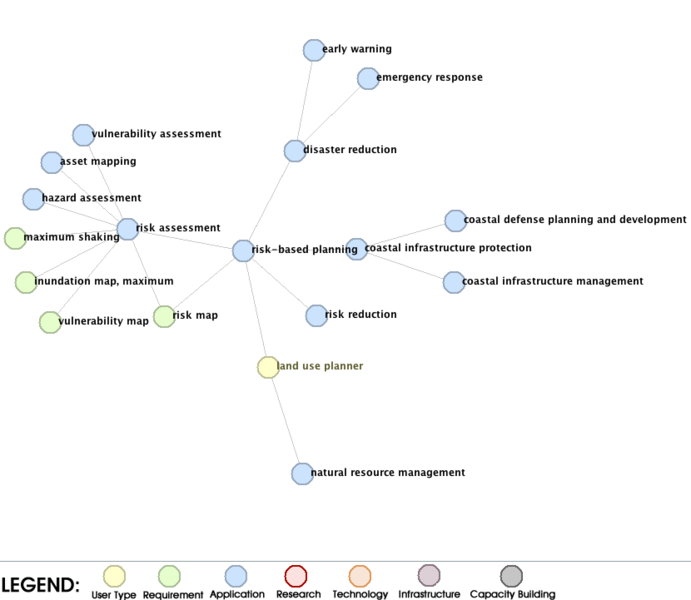 Analysis example: Risk Management - How are seismic observations linked to other URR entries? Here we provide two examples of analyses that are possible with the current version of the URR. In the first example, we want to find how a requirement for seismic observations is connected to other entries. The entry for this requirement is shown on the left. At the bottom, we see a link to relationships. After a click on the 'Relationship' button, a graphical interface opens that displays all current linkages of the Seismicity requirement up to a link level of two (see the Glossary for an explanation of the term "link level"). At the bottom of the diagram, the meaning of the symbol colors is explained. Currently, the seismicity requirement is linked to two applications, i.e., 'hazard analysis, determination of pdf' and 'hazard detection', which in turn are linked to many other requirements, applications, etc. We now want to explore in more detail the application 'hazard analysis, determination of pdf' and move the cursor over the respective symbol until the hyperlink symbol appears. We see that this applications depends on many requirements and feeds into the application 'hazard assessment'. Note that currently the directionality of the links is not displayed. Now we move to 'hazard assessment'. The application 'hazard assessment' is linked to 'risk assessment'. We want to further explore this value chain from the observational requirement for seismicity down to the ultimate end application. The application 'risk assessment' depends also on 'asset mapping' and 'vulnerability assessment', and it feeds into 'risk-based planning'. Output of 'risk assessment' are risk maps that are an requirement for 'risk-based planning'. Moving to 'risk-based planning' ... we see that this application includes besides the risk assessment also the applications 'risk reduction' and 'disaster reduction'. Currently, it also feeds into the application 'coastal infrastructure protection', which we will take as the starting point for the second example available here. Of course, risk-based planning is an application that can be linked to many other applications, but these links have not been published so far. |