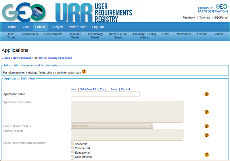 Introduction In the context of the URR, applications are processes that depend on earth observations or derived information. Similar to user types, the goal is to identify applications sufficiently different from each other in terms of information needs and output, and/or importance for decision making. The edit functions are described in detail in the Edit tutorials included in the General section for the Publish menue, specifically for the functions New, Edit/View all, Copy, Save, and Cancel. Although Save will carry out a check for uniqueness of the entry name, it is recommended to check the URR for similar or identical application names before entering an anticipated new application name into a blank form. You may check the list of existing applications, which can be accessed through the 'Edit/View all' button for the intended name or similar entries. The list of all published applications includes the application name of each entry, the date of the last update, the number of comments available for the entry, and the date and author of the last comment on the entry. It may also be helpful to conduct a search for a major keyword associated with the anticipated new application, which may lead to the discovery of entries that refer to a similar application with slightly different name (see the tutorials on searches). |