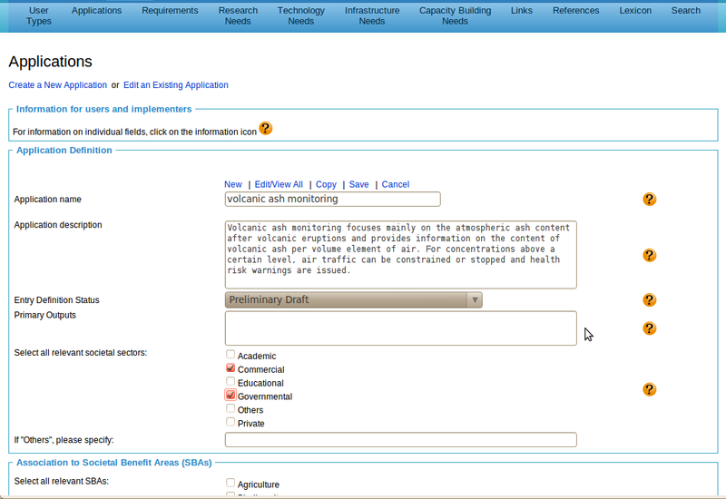 Publishing New Application: Initiating a new Entry Publishing a new application starts with clicking on the 'New' link and entering the anticipated new application name into the respective input field and then clicking on the 'Save' button. In the example, we have entered the application name 'volcanic ash monitoring'. After a click on Save, we are informed that the new entry has been successfully added and we can now edit this entry. We can now complete the form. Note that partial entries can also be saved. In case you need to leave a form before finishing the complete entry, it is important to save the partial entry by clicking on the 'Save' button. Otherwise, all entered information is lost. In order to publish the new entry, we complete the form. We first enter a concise description of the application, which in many cases can be modified and extended from a corresponding entry in a standard dictionary. The entry definition status indicates to what extent the entry is completed. In many cases, it is safe to select initially 'Preliminary Draft' in the drop down menu (not shown). The choice of societal sectors impacts to what extent the entry is discovered in searches. In order to make meaningful choices, it is recommended to be conservative and restrict the selection to those sectors to which the user type is clearly associated. In our example, we could have selected 'Academic' in addition to 'Commercial' and 'Governmental' since the monitoring of volcanic ash also has many research applications, but we preferred to focus on the main operational monitoring for governmental and commercial purposes. |