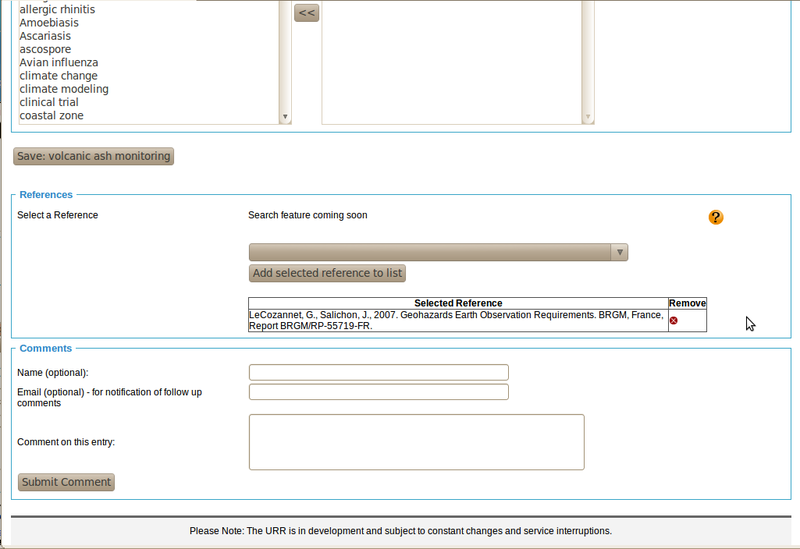 Linking to references Once we have completed and saved the entry, the form fields for references and comments are active. We select one or more relevant references from the list of available references. The number of reference that can be linked to an entry is not limited. References can be removed by clicking on the 'delete' icon. |