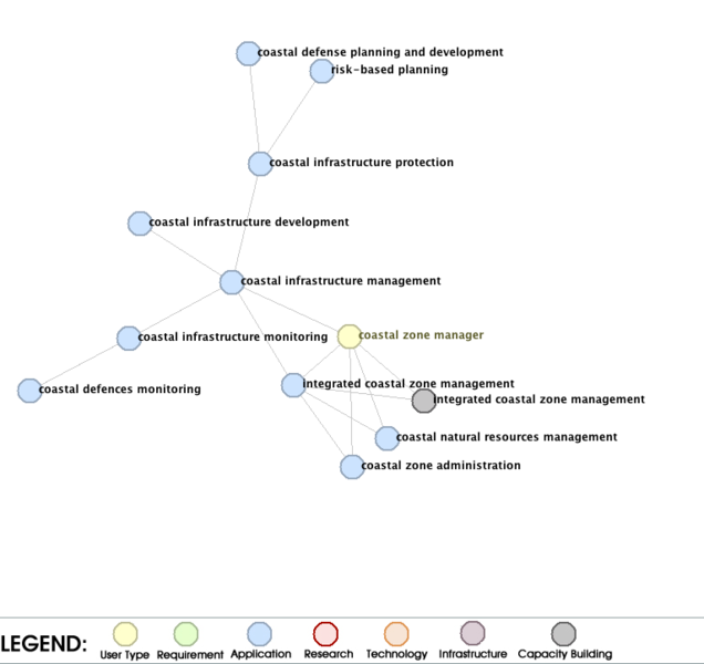Exploring the URR Contents Related to ICZM In the development of a structural diagram for a specific area such as ICZM, the graphical tool of the URR can be useful to ensure a reasonable structure. The graphics shows the current contents of the URR if ICZM is used as the center of the graphics. If the directionality of the links would be visible, we would see that ICZM is currently not a source of any of the Links entries in the URR. Thus, it is a root entry at the end of a number of value chains from observations to end applications and end users. A key end user type associated with ICZM is the coastal zone manager, which in fact may be located in a number of agencies and organizations. At this end level, the URR contents reflects the overall picture already very well, with the first to levels of ICZM fully captured. ICZM as a whole is also connected to a capacity building need and so is the user type coastal zone manager. At the third level, the current URR content is not complete and does not yet capture all information depicted in the global ICZM diagram. For example, for coastal infrastructure management, only a few of the third level applications have been published so far. However, for risk-based planning, the complete picture is more or less capture, as can be seen in the separately discussed risk-based planning example. |