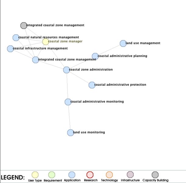Exploring the URR Contents Related to ICZM In the development of a structural diagram for a specific area such as ICZM, the graphical tool of the URR can be useful to ensure a reasonable structure. The graphics shows the current contents of the URR if ICZM is used as the center of the graphics. If the directionality of the links would be visible, we would see that ICZM is currently not a source of any of the Links entries in the URR. Thus, it is a root entry at the end of a number of value chains from observations to end applications and end users. A key end user type associated with ICZM is the coastal zone manager, which in fact may be located in a number of agencies and organizations. At this end level, the URR contents reflects the overall picture already very well, with the first to levels of ICZM fully captured. ICZM as a whole is also connected to a capacity building need and so is the user type coastal zone manager. At the third level, the current URR content is not complete and does not yet capture all information depicted in the global ICZM diagram. For example, for coastal infrastructure management, only a few of the third level applications have been published so far. However, for risk-based planning, the complete picture is more or less capture, as can be seen in the separately discussed risk-based planning example. Similarly, for coastal zone administration most of the third-level applications have not yet been published. |