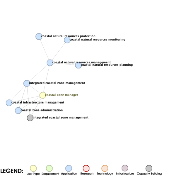Exploring the URR Contents Related to ICZM In the development of a structural diagram for a specific area such as ICZM, the graphical tool of the URR can be useful to ensure a reasonable structure. The graphics shows the current contents of the URR if ICZM is used as the center of the graphics. If the directionality of the links would be visible, we would see that ICZM is currently not a source of any of the Links entries in the URR. Thus, it is a root entry at the end of a number of value chains from observations to end applications and end users. A key end user type associated with ICZM is the coastal zone manager, which in fact may be located in a number of agencies and organizations. At this end level, the URR contents reflects the overall picture already very well, with the first to levels of ICZM fully captured. ICZM as a whole is also connected to a capacity building need and so is the user type coastal zone manager. At the third level, the current URR content is not complete and does not yet capture all information depicted in the global ICZM diagram. For example, for coastal infrastructure management, only a few of the third level applications have been published so far. However, for risk-based planning, the complete picture is more or less capture, as can be seen in the separately discussed risk-based planning example. Similarly, for coastal zone administration most of the third-level applications have not yet been published. The graphics centered on coastal natural resource management shows that none of the third level application have been added to the URR yet. These examples illustrate how the graphical tool of the URR can be used as a viable control to ensure that the results of a global analysis carried out outside of the URR are fully published in the URR. |