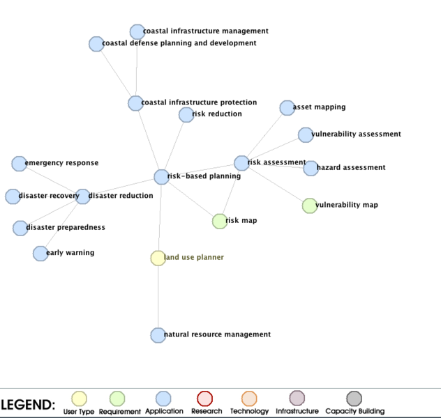 Extending the Analysis of Risk-Based Planning In the next level, we have broken down each of the applications under risk-based-planning into several applications. For risk mapping and assessment, we use the governing equation to define the applications at the next level. The risk equation basically states that risk equals hazard probability times vulnerability of assets times the value of assets exposed to the hazard, which translates into three applications that provide the information required for the use of this equation. For risk reduction, the sub-devision is based on the fact that we have often little means to impact the hazard probability and can reduce risk through reduction of vulnerability and exposure. Land use planning is key for reducing exposure to hazards, while building codes are key for a reduction of vulnerability. Insurance strategies can provide an incentive to reduce risk, and protection against hazards (e.g., through dikes and levees in the case of floods, storm surges and tsunamis) can also be used to reduce the exposure to hazards. For disaster reduction, timely development of preparedness and planning is important. In many cases, early warning can help reduce the exposure to hazards dramatically (e.g., through evacuations), and it also supports emergency response planning and immediate initiation of response actions. Finally, in the recovery phase, the long-term impacts of disasters can be reduced significantly and by learning from the disaster, the risk of future disasters can also be reduced. We could continue to use the top-down approach to define the next level of risk-based planning. An initial (though incomplete) sketch including a third level under risk-based-planning is shown on the left. However, the diagram gets rapidly too complex to provide the full details. Therefore, it makes sense to use a more local approach to complete the environment for the applications at the higher levels. Using the graphical tool of the URR, the picture of the current URR content for risk-based planning reveals a focus on application. It also shows that for risk reduction, the third level has not yet been added. So far, risk-based planning has only been linked to the protection of coastal infrastructure, but far more applications use a risk-based planning approach. |