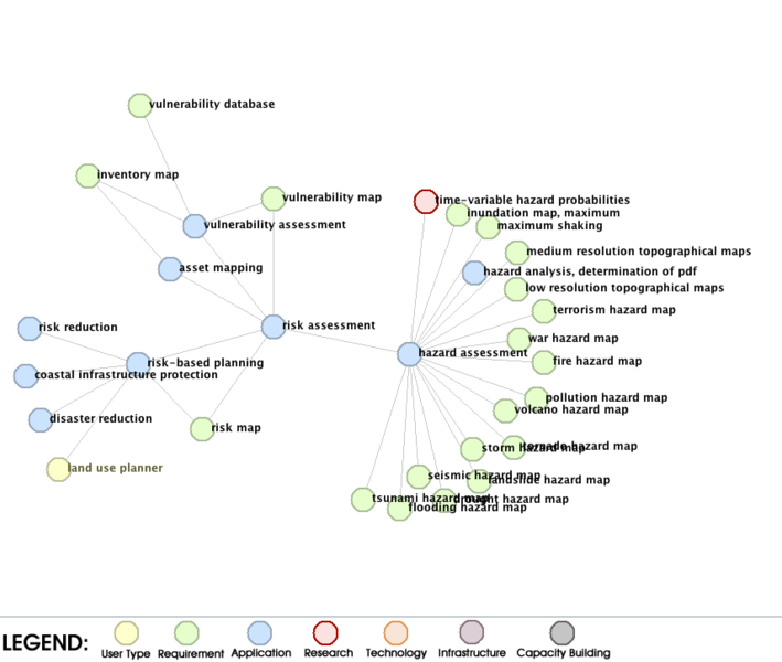 Adding Details to the Analysis of Risk-Based Planning In the sketch shown on the left, we have added a number of requirements and research needs that feed into the many applications at the third level below risk-based planning. It seems like it would be possible to continue to use the global approach at that level to capture most of the applications and requirements. However, adding in user types and various other needs would easily render the sketch unreadable. We have used the application early warning as an example to illustrate a local approach to the construction of the environment of this application, see Early Warning example. Here we discuss the three applications under risk mapping and assessment as examples of a combined local and global approach. Hazard assessment should provide all information and spatial distribution and probability of hazards. Vulnerability and Assets adds the additional information needed to carry out a risk assessment. Using the URR graphical tool, we can visualize what is already available for the application risk assessment. Note that in the URR, we have made the name of the application rather short partly because we do not want the graphical presentation to be overloaded with long titles. |