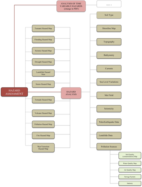 Hazard Assessment The sketch on the left shows a top-down analysis of the application hazard assessment. The input for the assessment is the result of a detailed hazard analysis, which ideally provides maps of hazard intensities and probabilities (probability density functions). The application hazard analysis in turn depends on many observations. In most cases, the requirements for hazard analysis can be broken down into more applications and requirements. The sketch shows at the bottom such a break down for the pollution source requirement. |