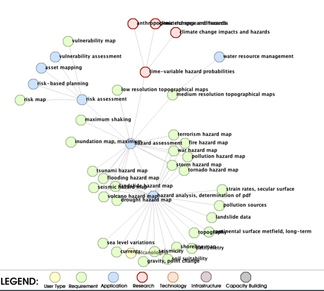 Hazard Assessment The sketch on the left shows a top-down analysis of the application hazard assessment. The input for the assessment is the result of a detailed hazard analysis, which ideally provides maps of hazard intensities and probabilities (probability density functions). The application hazard analysis in turn depends on many observations. In most cases, the requirements for hazard analysis can be broken down into more applications and requirements. The sketch shows at the bottom such a break down for the pollution source requirement. Currently, hazard analysis mainly takes a static view in the sense that hazard PDFs do not change significantly over time. However, for a number of hazards, climate change and other anthropogenic changes to the Earth system likely will impact the PDFs significantly. Therefore, the application hazard assessment also includes in the next level the application analysis of time variable hazards, which looks at climate change and hazards (e.g., the change in storms, floods, droughts, heat waves, etc.), climate change impacts and hazards (e.g., the effect of sea level rise on coastal flooding and the changes in landslide probability due to permafrost melting), anthropogenic changes and hazards (e.g., the change on landslide probability caused by changes in land cover or construction of infrastructure), and other potential environmental factors (e.g., the effect of the loss of mangroves and wetlands on coastal flooding). Finally, we take a look at the current contents of the URR based on a graphics with hazard assessment in the center. |