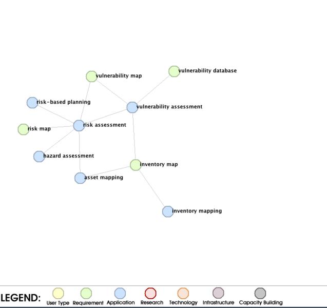 Analysis of Vulnerability and Asset Assessment The sketch shows the top-down approach to the analysis of the two application vulnerability assessment and asset assessment. Both application depend on inventories of the assets distributed in space. These maps include both the built environment and natural resources, as well as information on socio-economic services of these assets. The asset assessment will attach an economic value to all these assets. Ideally, the vulnerability assessment will take the inventory and determine the vulnerability of each asset to potential hazards based on a database of vulnerabilities for all potential assets and hazards. Looking at the current contents of the URR based on a graphics with vulnerability assessment in the center, we notice that the link between risk assessment and vulnerability assessment is complemented through the requirement vulnerability map, while the link between asset mapping and risk assessment does not show the requirement for maps of asset value. Likewise, the requirement for risk maps is not yet linked to risk-based planning. |