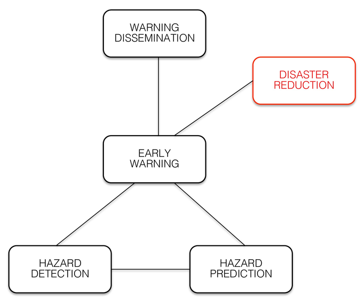 Starting Point for the Analysis of Early Warning In this example, we use a more local approach, we explain the steps involved in the analysis of the user needs and requirements associated with Early Warning. With this example we illustrate that a local approach can be used to populate the URR for an area centered around a single application. In terms of early warning, we need to have three main applications in place: (1) we need to be able to detect hazards in a timely manner; (2) for some hazards, we need to be able to predict the development of the hazard in space and over time; (3) we need to be able to disseminate the alerts and warning messages to those who need to take action (both systems and human beings). Of course, 'Early Warning' is linked to the broader application 'Disaster Reduction,' which is part of disaster risk management and risk-based planning. |