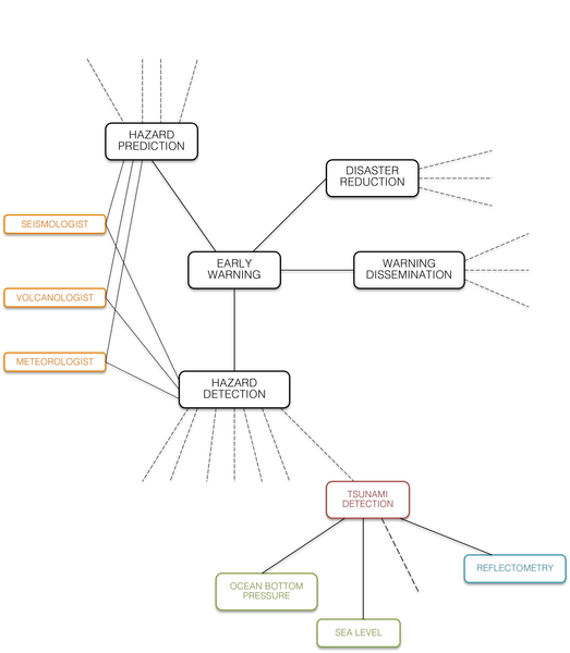 Adding Details to the Local Environment Observational requirements can be added to the applications that detect individual hazards. For example, 'tsunami detection' (at the bottom of the sketch) currently uses ocean bottom pressure and sea level (from tide gauges). Research indicates that GNSS reflectometry from space could detect tsunamis in the open ocean, and there is a need to develop this technology. There may be user types that are linked to both hazard detection and hazard prediction. They can be added as the information becomes available. |
