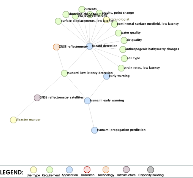 Analyzing the Local Environment The current version of the graphical interface allows a basic analysis of a local environment. Several analysis examples are discussed in the Analysis Examples tutorial. In the example shown to the left, we used the graphics for the application early warning, and we clicked on the symbol for hazard prediction. This makes hazard prediction to the center of the environment. We see now that the sub-applications of hazard prediction are far from complete. For several of the available sub-applications, research needs are identified. Compared to the graphics shown in the previous screen, the user type volcanologist display now several applications, research needs, infrastructure needs, and requirements that were not shown earlier. The reason is that early warning and volcanologist have a link level of two, while volcanologist and hazard prediction have a link level of one. As a next step, we make tsunami propagation prediction to the center of the graphics. We now 'discover' the research need and infrastructure need connected to the requirement for low latency earthquake displacement field. However, we have to note here that the requirements, research needs, infrastructure needs and capacity building needs for the overall tsunami early warning complex are not complete yet, and the current graphics can be used to identify the missing bits and pieces. Jumping to the requirement tsunami low latency detection, we see that this requirement is linked to technology and infrastructure needs. This indicates that currently, low latency detection of tsunamis is not fully implemented because of a lack of technology and infrastructure. |