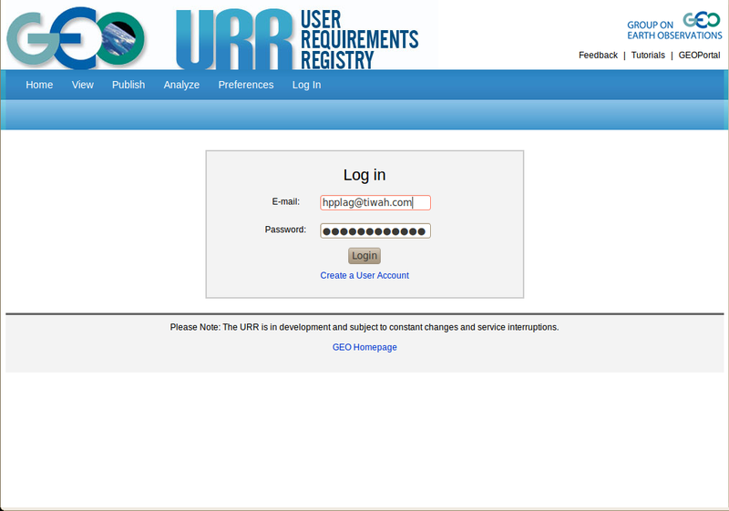 Create a User Account Login is required before the Publish menu can be accessed. If you do not have a user account, you can register as a user by clicking on the 'Create a user account' link. All that is needed for registration is a valid e-mail address and a password of your own choice. The e-mail address is only used for internal identification and will not be shared with anyone outside the URR. You have to enter a valid e-mail address and a password. Providing an invalid e-mail address will result in an error message. Make sure that the entered e-mail address is correct. Note that no confirmation of the password is requested. Therefore, make sure the password is correctly typed in. |