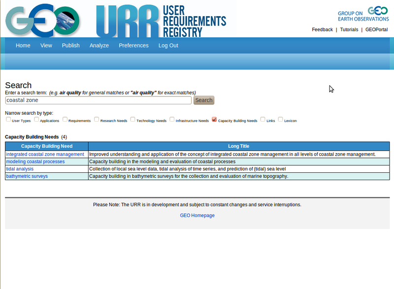 Editing an Existing Capacity Building Need Entry There are several ways of loading an existing capacity building need entry into the form for further edits. You can access an entry through the list that comes up after clicking on 'Edit/View all'. You can also type the name of the capacity building need into a blank form and then click on Save. Save will check for an existing entry with this name, and it will load this entry if it already exists. In the example, we typed in 'integrated coastal zone management', which after a click on the 'Save' button, resulted in the form as shown. For capacity building needs, this approach is not practical since capacity building needs often have long names. The same result could have been reached more easily by first bringing up the list of all capacity building needs and then clicking on 'integrated coastal zone management'. Another way of populating a form with an existing entry is to perform a search with appropriate text string and then selecting the desired entry. In the example, we conducted a search for 'coastal zone' and limit the search to Capacity Building Needs', which brought up the list as shown. We can now click on the entry name to load the entry for 'integrated coastal zone management' into the form for further edits. |
