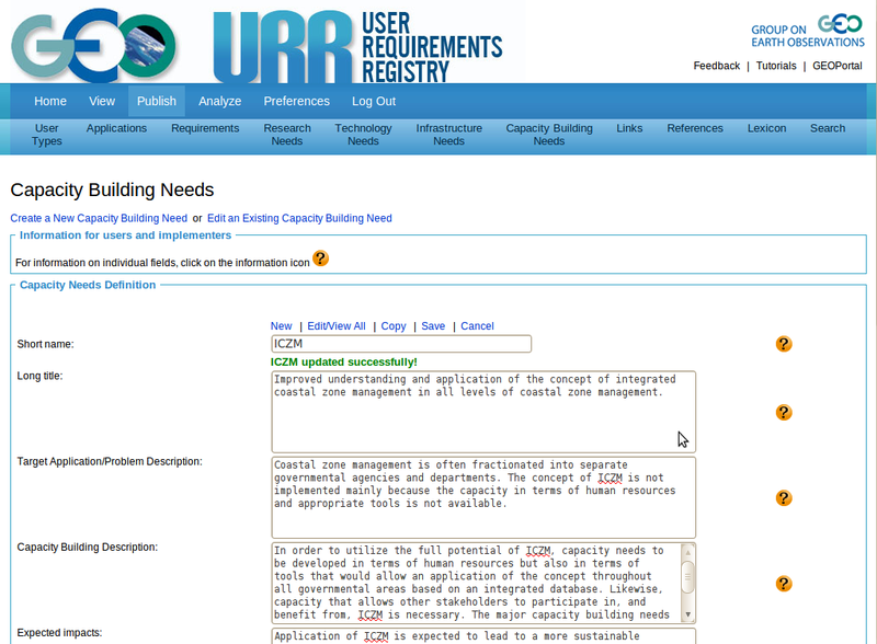 Editing an Existing Capacity Building Need Entry There are several ways of loading an existing capacity building need entry into the form for further edits. You can access an entry through the list that comes up after clicking on 'Edit/View all'. You can also type the name of the capacity building need into a blank form and then click on Save. Save will check for an existing entry with this name, and it will load this entry if it already exists. In the example, we typed in 'integrated coastal zone management', which after a click on the 'Save' button, resulted in the form as shown. For capacity building needs, this approach is not practical since capacity building needs often have long names. The same result could have been reached more easily by first bringing up the list of all capacity building needs and then clicking on 'integrated coastal zone management'. Another way of populating a form with an existing entry is to perform a search with appropriate text string and then selecting the desired entry. In the example, we conducted a search for 'coastal zone' and limit the search to Capacity Building Needs', which brought up the list as shown. We can now click on the entry name to load the entry for 'integrated coastal zone management' into the form for further edits. The name of an existing entry can be changed. In the example, we have changed 'integrated coastal zone management' into 'ICZM'. Clicking on Save initiates an uniqueness check. Since no entry with the new name existed, the name change is accepted. |