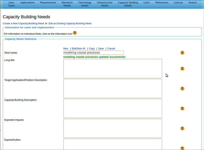 Publishing New Capacity Building Needs: Starting a new entry Publishing a new capacity building starts with clicking on the 'New' link and entering the anticipated new capacity building need name into the respective input field. We then click on the 'Save' button. In the example, we have entered the capacity building need name 'modeling coastal process'. After a click on Save, we are informed that the new entry successfully has been inserted, and we can now edit this entry. |