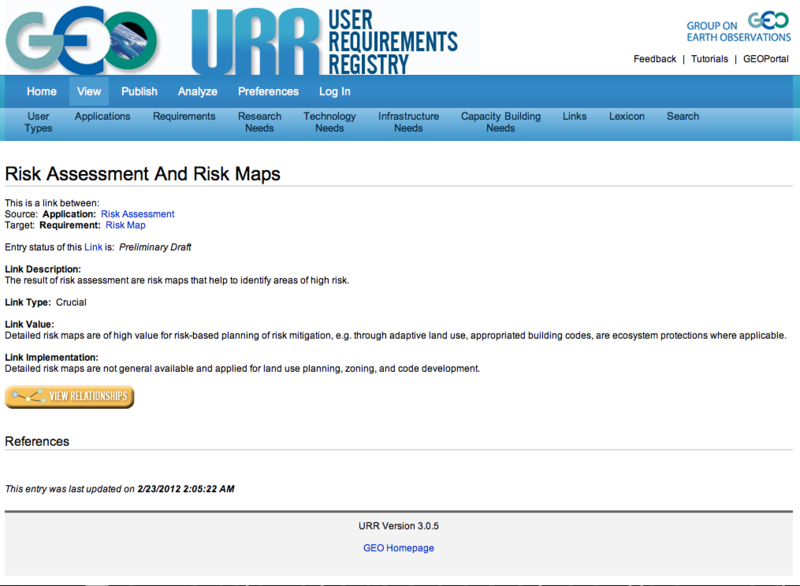 Link Direction Conventions Considering the relations as tables, the URR link concept can be visualized as a connection between a specific row in one relation to a specific row in the same or another table. These links are directional, that is, one of the entries is the source, and the other the target of the link. The directionality of the links should be chosen such that it follows the value chain from original Earth observations down to end users. For example, if an application depends on a requirement, the requirement should be the source and the application the target. If an application produces a data set described through a Requirements entry, then the Applications entry should be the source and the Requirements entry the target. The URR aims to capture user types that are benefiting from the information produced by an application and normally, they should be the target of a link with an application or a requirement as the source. The example shown links a source application (risk assessment) to a target requirement (risk map), indicating that risk maps are the output of risk assessments. |