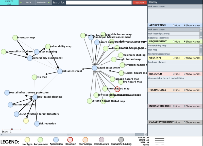 Link Direction Conventions Considering the relations as tables, the URR link concept can be visualized as a connection between a specific row in one relation to a specific row in the same or another table. These links are directional, that is, one of the entries is the source, and the other the target of the link. The directionality of the links should be chosen such that it follows the value chain from original Earth observations down to end users. For example, if an application depends on a requirement, the requirement should be the source and the application the target. If an application produces a data set described through a Requirements entry, then the Applications entry should be the source and the Requirements entry the target. The URR aims to capture user types that are benefiting from the information produced by an application and normally, they should be the target of a link with an application or a requirement as the source. The example shown links a source application (risk assessment) to a target requirement (risk map), indicating that risk maps are the output of risk assessments. The diagram of the environment of this link shows that the applications hazard assessment, vulnerability assessment, and asset mapping feed into risk assessment, which produces the riks map needed for risk-based planning. |