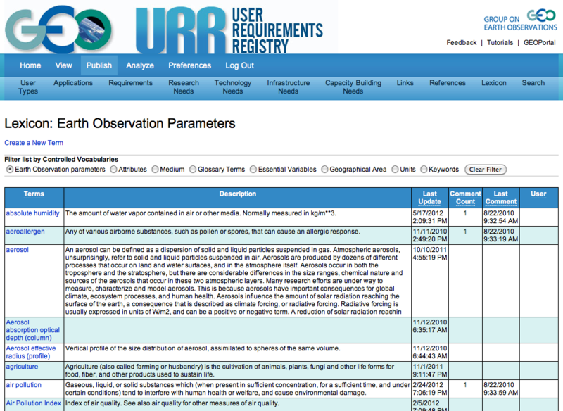 An acronym is defined together with a term. The membership of a term in any of the other vocabularies is indicated by the respective choice of the select buttons. To view a specific controlled vocabulary, you can chose a vocabulary in the list of vocabularies available at the top of the list of all Lexicon terms. For example, we have marked 'Earth observation parameters and this automatically updates the list of entries to show only those terms that are Earth observation parameters. Note that there is a slight time delay between marking a specific vocabulary and the update of the list. |