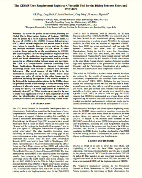 - Plag, H.-P., Ondich, G., Kaufman, J., Foley, G., Pignatelli, F., 2011. The GEOSS User Requirement Registry: A Versatile Tool for the Dialog Between Users and Providers. Proceed. 34th Internat. Symp. Remote Sensing of the Environment, Sydney, April 10-15, 2011, available at http://www.isprs.org/proceedings/2011/ISRSE-34/211104015Final00579.pdf.