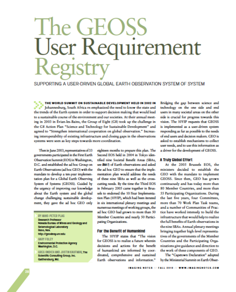 - Plag, H.-P., Ondich, G., Kaufman, J., Foley, G., 2010. The GEOSS User Requirement Registry - Supporting a User-Driven Global Earth Observation System of Systems. Imaging Notes, 25(4), 28-33. (reprint: pdf)