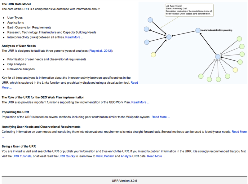 The URR Home page provides a number of brief explanations on main subjects each linking to 'Read more ...' pages that give more details on each subject. The first such 'Read more ...' introduces the Global Earth Observing System of Systems (GEOSS) and the GEOSS Common Infrastructure (GCI) of which the URR is a part. The home page also gives access to an introductory video explaining the purpose and functionality of the URR. The other 'Read mores' explain the URR data model, introduce the analyses possible in the URR, reflect on the role of the URR for the Work Plan implementation, comment on aspect of populating the URR, and introduce the methods that can be used to identify user needs and observational requirements. The finally 'Read more' give a very brief overview of how to use the URR. |