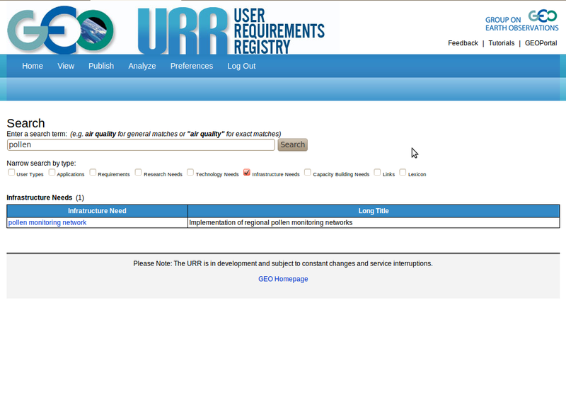 Editing an Existing Infrastructure Need Entry There are several ways of loading an existing infrastructure need entry into the form for further edits. You can access an entry through the list that comes up after clicking on 'Edit/View all'. You can also type the name of the infrastructure need into a blank form and then click on Save. Save will check for an existing entry with this name, and it will load this entry if it already exists. In the example, we typed in 'pollen monitoring network', which after a click on the 'Save' button, resulted in the form as shown. For infrastructure needs, this approach is not practical since infrastructure needs often have long names. The same result could have been reached more easily by first bringing up the list of all infrastructure needs and then clicking on 'pollen monitoring network'. Another way of populating a form with an existing entry is to perform a search with appropriate text string and then selecting the desired entry. In the example, we conducted a search for 'pollen' and limited this search to Infrastructure Needs, which brought up the list as shown. We can now click on the entry name to load the entry for 'pollen monitoring networks' into the form for further edits. |