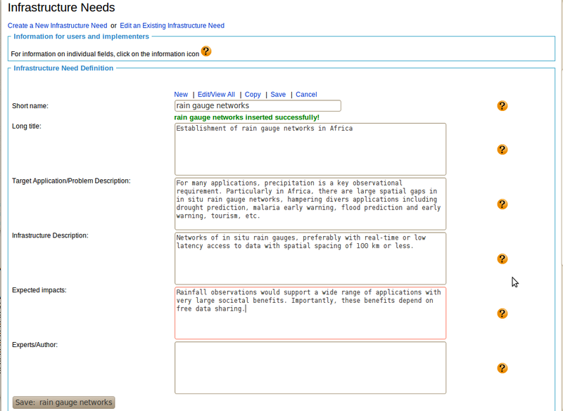 Publishing New Infrastructure Needs: Starting a new entry Publishing a new infrastructure need starts with clicking on the 'New' link and entering the anticipated new infrastructure need name into the respective input field. We then click on the 'Save' button. In the example, we have entered the infrastructure name 'rain gauge networks'. After a click on Save, we are informed that the new entry successfully has been inserted, and we can now edit this entry. We can now complete the form. Note that partial entries can also be saved. In case you need to leave a form before finishing the complete entry, it is important to save the partial entry by clicking on the 'Save' button. Otherwise, all entered information is lost. In order to publish the new entry, we complete the form. We first enter the long title of the infrastructure need, which should indicated the required infrastructure in more detail. In the field 'Target Application/Problem Description' we give a brief description of the problem and/or application that the infrastructure would address/support. The entry in the field 'Infrastructure description' concisely identifies the required infrastructure, and in the field 'Expected Results', we focus on the enabled application and the societal benefits. Currently, the entry definition status cannot be indicates to what extent the entry is completed. This feature wil be added soon. In many cases, it is safe to select initially 'Preliminary Draft' in the drop down menu (not shown). |