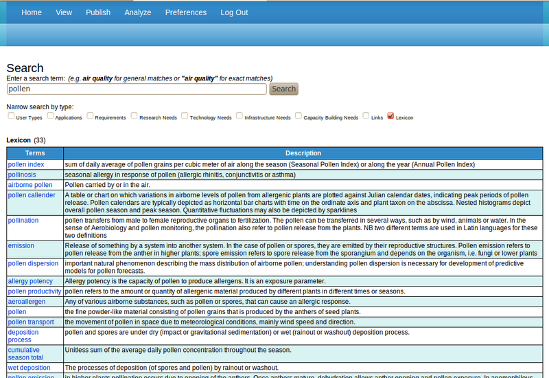 Editing an Existing Term There are several ways of loading an existing term entry into the form for further edits. You can access an entry through the list that comes up after clicking on 'Edit/View all'. You can also type the term into a blank form and then click on Save. Save will check for an existing entry with this name, and it will load this entry if it already exists. In the example, we typed in 'landslide', which after a click on the 'Save' button, resulted in the form as shown. The same result could have been reached by first bringing up the list of all terms and then clicking on 'landslide'. Another way of populating a form with an existing entry is to perform a search with appropriate text string and then selecting the desired entry. In the example, we conducted a search for 'pollen' on the lexicon, which brought up the list as shown. We can now click on the entry name of, for example, 'pollen calendar' to load the entry into the form for further edits. |