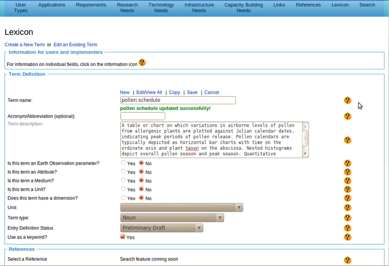Editing an Existing Term There are several ways of loading an existing term entry into the form for further edits. You can access an entry through the list that comes up after clicking on 'Edit/View all'. You can also type the term into a blank form and then click on Save. Save will check for an existing entry with this name, and it will load this entry if it already exists. In the example, we typed in 'landslide', which after a click on the 'Save' button, resulted in the form as shown. The same result could have been reached by first bringing up the list of all terms and then clicking on 'landslide'. Another way of populating a form with an existing entry is to perform a search with appropriate text string and then selecting the desired entry. In the example, we conducted a search for 'pollen' on the lexicon, which brought up the list as shown. We can now click on the entry name of, for example, 'pollen calendar' to load the entry into the form for further edits. The name of an existing entry can be changed. In the example, we have changed 'pollen calendar' into 'pollen schedule'. Clicking on Save initiates an uniqueness check. Since no entry with the new name existed, the name change is accepted. |