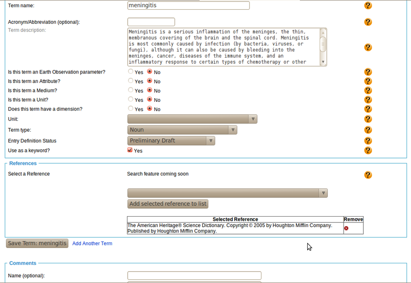 Linking to references Once we have completed and saved the entry, the form fields for references and comments are active. We select one or more relevant references from the list of available references. The number of reference that can be linked to an entry is not limited. References can be removed by clicking on the 'delete' icon. |
