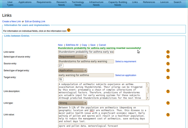 Editing an Existing Link There are several ways of loading an existing link entry into the form for further edits. A quick way is to access an entry through the list that comes up after clicking on 'Edit/View all'. In the example, we selected 'air quality information for the public' from the list, which resulted in the form as shown. Another way of populating a form with an existing entry is to perform a search with appropriate text string and then selecting the desired entry. In the example, we conducted a search for 'asthma' on the links, which brought up the list as shown. We can now click on the entry name of, for example, 'thunderstorm and asthma early warning' to load the entry into the form for further edits. The name of an existing entry can be changed. In the example, we have changed 'thunderstorms and asthma early warning' into 'thunderstorm probability for asthma early warning'. Clicking on Save initiates an uniqueness check. Since no entry with the new name existed, the name change is accepted. |