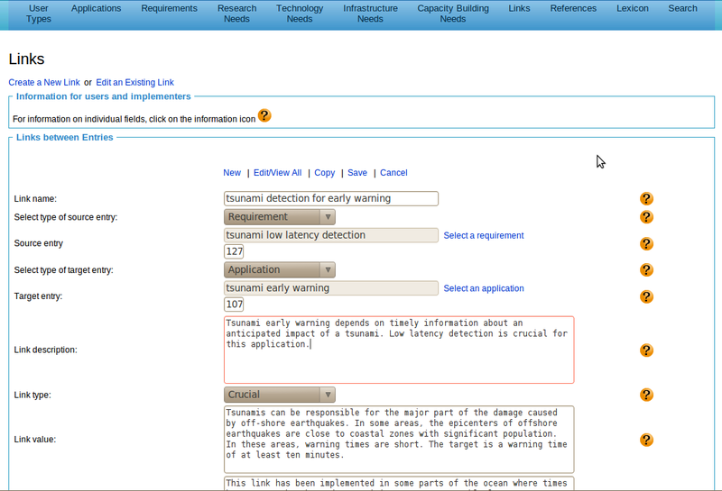 Publishing New Links: Starting a new entry Publishing a new links starts with clicking on the 'New' link and entering the anticipated name of the new link into the respective input field. For links, we also needed to identify the types of the source and target of the link. We then can click on the 'Save' button. In the example, we have entered the name 'tsunami detection for early warning' and selected Requirement and Application as source and target, respectively. After a click on Save, we are informed that the new entry successfully has been inserted, and we can now edit this entry. We can now complete the form. Note that partial entries can also be saved. In case you need to leave a form before finishing the complete entry, it is important to save the partial entry by clicking on the 'Save' button. Otherwise, all entered information is lost. We first enter a concise description of the link. The description should give an account of the rationale for this link. The information in the link value should allow the assessment of the economic and societal value of the link, if fully implemented. In the field tagged link implementation, information on the current status of the link realization and options for improved implementation should be provided. Information on relevant observations already collected but not available for the link implementation, missing infrastructure, or available infrastructure that could be used, but is currently not used, all are important parts of the information to be provided here. The entry definition status indicates to what extent the entry is completed. In many cases, it is safe to select initially 'Preliminary Draft' in the drop down menu (not shown). |