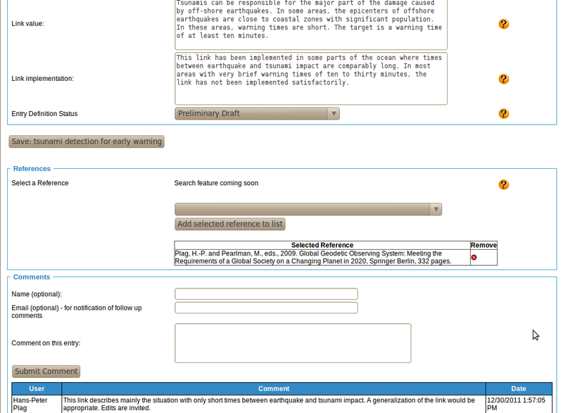 Adding comments In this example, we add a comment on the new entry for 'tsunami detection for early warning' inviting further discussions and improvements of this entry. Since currently no information about publishers is automatically stored, it is recommended that you add a comment with your name, e-mail address and an information about the status of the entry so that other are informed about the origin. After clicking on 'Submit Comment', the comment is permanently stored and displayed at the end of the form. Comments are displayed in reversed chronological order. |