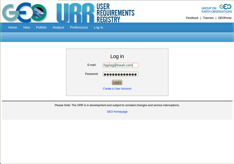 Logging into the URR Login is required before the Publish menu can be accessed. Once the Preferences menu is available, logging in will also provide access to several of the preferences and ensure that your preferences are available for subsequent sessions. If you do not have a user account, you can register as a user by clicking on the 'Create a user account' link (see the Create Account tutorial). If you already have an account, you can type in the email address associated with the account and the password. After a click on 'Login', your will be able to publish new entries and edit existing ones. |