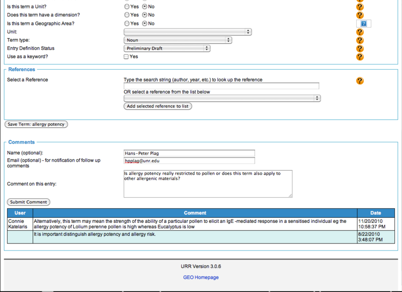 Commenting on Specific Entries Each of the publishing forms allows you to submit comments on individual entries. The fields for the submission of comments are at the end of each form. The example shows the entry for 'allergy potency' in the Lexicon form. Now a comment is being added that asks a question about the term definition. The provision of an author name is optional. To facilitate an interactive discussion of an entry, whenever a new comment is being added, e-mail notifications are sent to those who have published an entry or commented on the entry previously. |