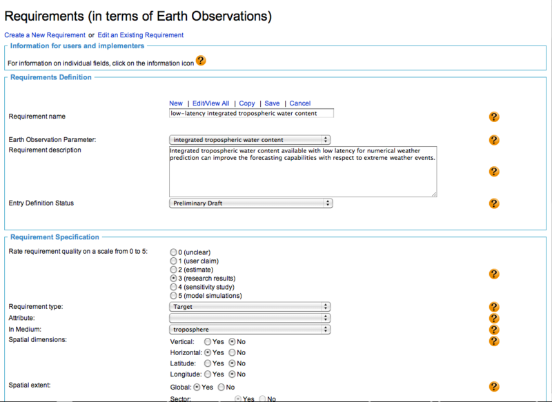 Associating Entries With References All publishing forms allow you to associate entries with references to articles and other documents available in the reference list of the URR to provide more information on an entry. You can do this association in the 'References' field at the end of each publishing form just above the 'Comments' field. If a desired reference is not in the References table, it can be added by going to the publishing form for references (see the References tutorial). After a reference has been published using this form, it is available for association with entries. For illustration, we load the existing entry 'low-latency integrated tropospheric water content' into the Requirements form. This is done by first clicking on the 'Edit/View All' link and then clicking on the desired requirement in the list. |