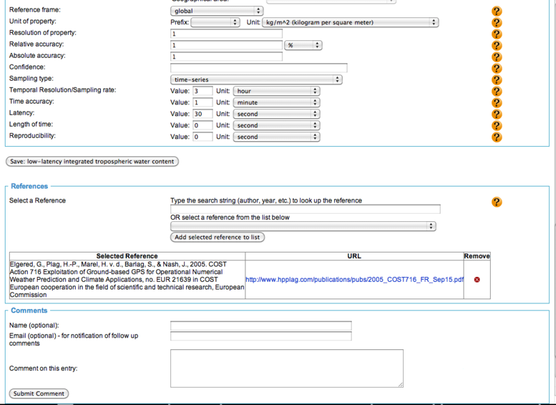 Associating Entries With References All publishing forms allow you to associate entries with references to articles and other documents available in the reference list of the URR to provide more information on an entry. You can do this association in the 'References' field at the end of each publishing form just above the 'Comments' field. If a desired reference is not in the References table, it can be added by going to the publishing form for references (see the References tutorial). After a reference has been published using this form, it is available for association with entries. For illustration, we load the existing entry 'low-latency integrated tropospheric water content' into the Requirements form. This is done by first clicking on the 'Edit/View All' link and then clicking on the desired requirement in the list. Once the entry is loaded, scroll down to the 'References' field of the form. By moving the cursor over the list icon and then clicking on this icon, the list of all available references is displayed. Alternatively, if parts of the reference are known (e.g., the first author name), then a search can be used to reduce the list of references. After the desired reference has been selected, it can be added to a list of references for the entry by clicking on 'Add selected reference to list'. Note that clicking on the 'Add' link adds the reference to the database entry and an additional click on the respective 'Save' button is not required. For all entries loaded in the respective form, a list of all selected references is displayed in the 'References' field. References can be added one at a time. References can be deleted from this list by simply clicking on the 'Delete' icon in the 'Remove' box. |