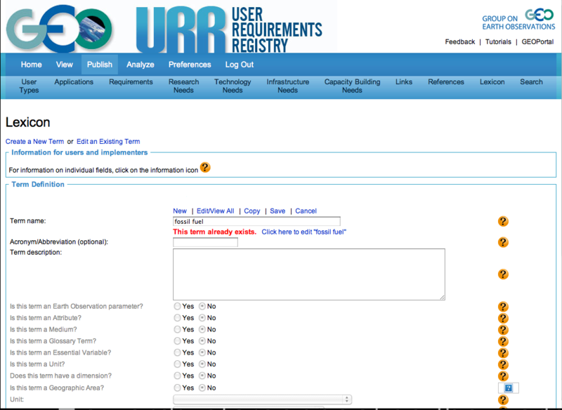 Publishing New Entries Here we use the Lexicon form as an example. Publishing new entries in the other forms is similar to publishing lexicon entries. Before publishing new entries, it should be checked whether an entry with this name or a rather similar entry already exists. This can be done by using the search function (see the search tutorial). Alternatively, a list of all entries in the Lexicon can be brought up by clicking on the 'Edit/View all' button (see the Edit/View all tutorial). Clicking on the 'New' button opens a blank form. In most forms, the 'Name' input field is the only active field in a blank form. The example shows such a blank form for Lexicon terms (where the 'Name' field is labeled as 'Term name'). For the Lexicon form, the 'Acronym' input field is also active in the blank form. After you enter the name of the new entry that you would like to publish (in our example, the new term 'estuary'), you have to click on the 'Save' button in order to activate all other fields. Clicking on the 'Save' button initiates a check whether an entry with the same name already exists. After clicking on 'Save', we are informed that the term 'estuary' has been successfully entered. All input fields are now open for editing. After all fields have been populated, the entry has to be saved by clicking on 'Save'. It is recommended to frequently save the form while editing. Note that leaving the form before saving will cause a loss of all edits made since the last save of the entry. If you make an attempt to leave a form after unsaved changes have been made, a warning message is issued and you will have to confirm that you actually want to leave the form without saving. If a new name is entered or the name of an existing entry is changed, the next click on 'Save' will initiate a check of whether the name already exists. If the new name already exists, a warning message is displayed and the entry is not saved. It is not possible to overwrite an existing entry. In our example, we entered the name 'fossil fuel', and the click on 'Save' resulted in the warning message that this entry already exists. |