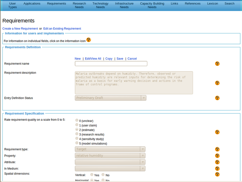 Copying Existing Entries If a form is populated with an existing entry, then the 'Copy' button can be used to create a copy of the entry as a template for a new but similar entry. In the example, we have populated the Requirements form with the entry for 'humidity for malaria early warning'. After clicking on 'Copy', the input field for the entry name (i.e., the term name field) is blank, while all other fields are gray, i.e., they cannot be edited. |