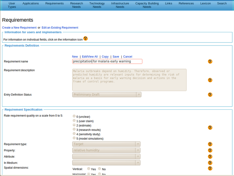 Copying Existing Entries If a form is populated with an existing entry, then the 'Copy' button can be used to create a copy of the entry as a template for a new but similar entry. In the example, we have populated the Requirements form with the entry for 'humidity for malaria early warning'. After clicking on 'Copy', the input field for the entry name (i.e., the term name field) is blank, while all other fields are gray, i.e., they cannot be edited. We now enter the name of the new entry we would like to create out of the copy. In our case, the new entry has the name 'air temperature for malaria early warning'. |