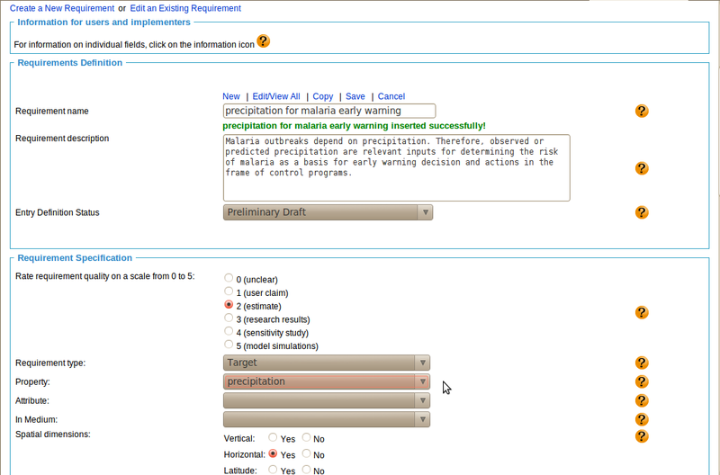 Copying Existing Entries If a form is populated with an existing entry, then the 'Copy' button can be used to create a copy of the entry as a template for a new but similar entry. In the example, we have populated the Requirements form with the entry for 'humidity for malaria early warning'. After clicking on 'Copy', the input field for the entry name (i.e., the term name field) is blank, while all other fields are gray, i.e., they cannot be edited. We now enter the name of the new entry we would like to create out of the copy. In our case, the new entry has the name 'air temperature for malaria early warning'. After we click on 'Save' and the system check for uniqueness has cleared the new name, we are able to make the necessary changes in all fields and save the entry. In many cases, using the Copy function can reduce significantly the information to be entered for a new entry. Besides editing the description, it is important to select the correct Earth observation parameter and to update the accuracy and resolution information further down in the form. Of course, if the new requirement has different spatial and temporal resolutions, these also need to be updated. |