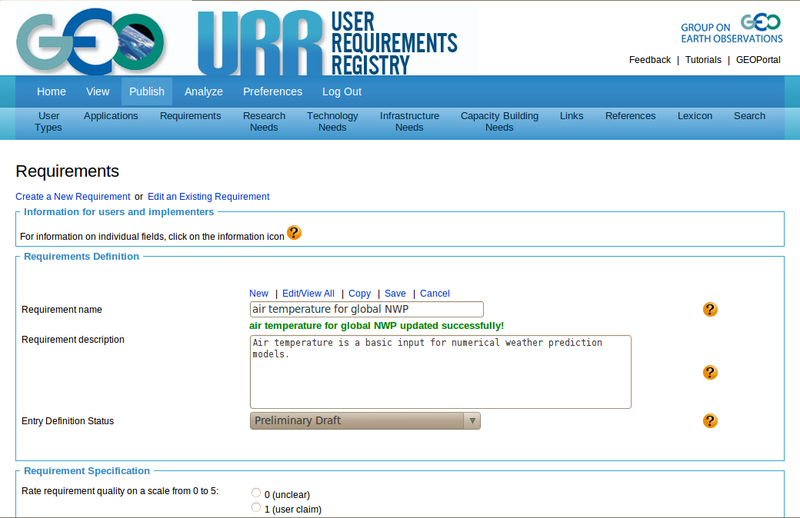 The first example shows a blank Application form after a new application name has been entered (in this example 'tsunami early warning') and a click on 'Save' has resulted in a confirmation that this entry has been successfully inserted, which implies the uniqueness of this name. The form is now open for entering the information for the new entry. The second example shows the form after the entry 'air temperature for global numerical weather prediction' has been loaded and the name has been changed to air temperature for global NWP'. A click on 'Save' has resulted in a confirmation that the entry with the new name has been successfully updated. |
